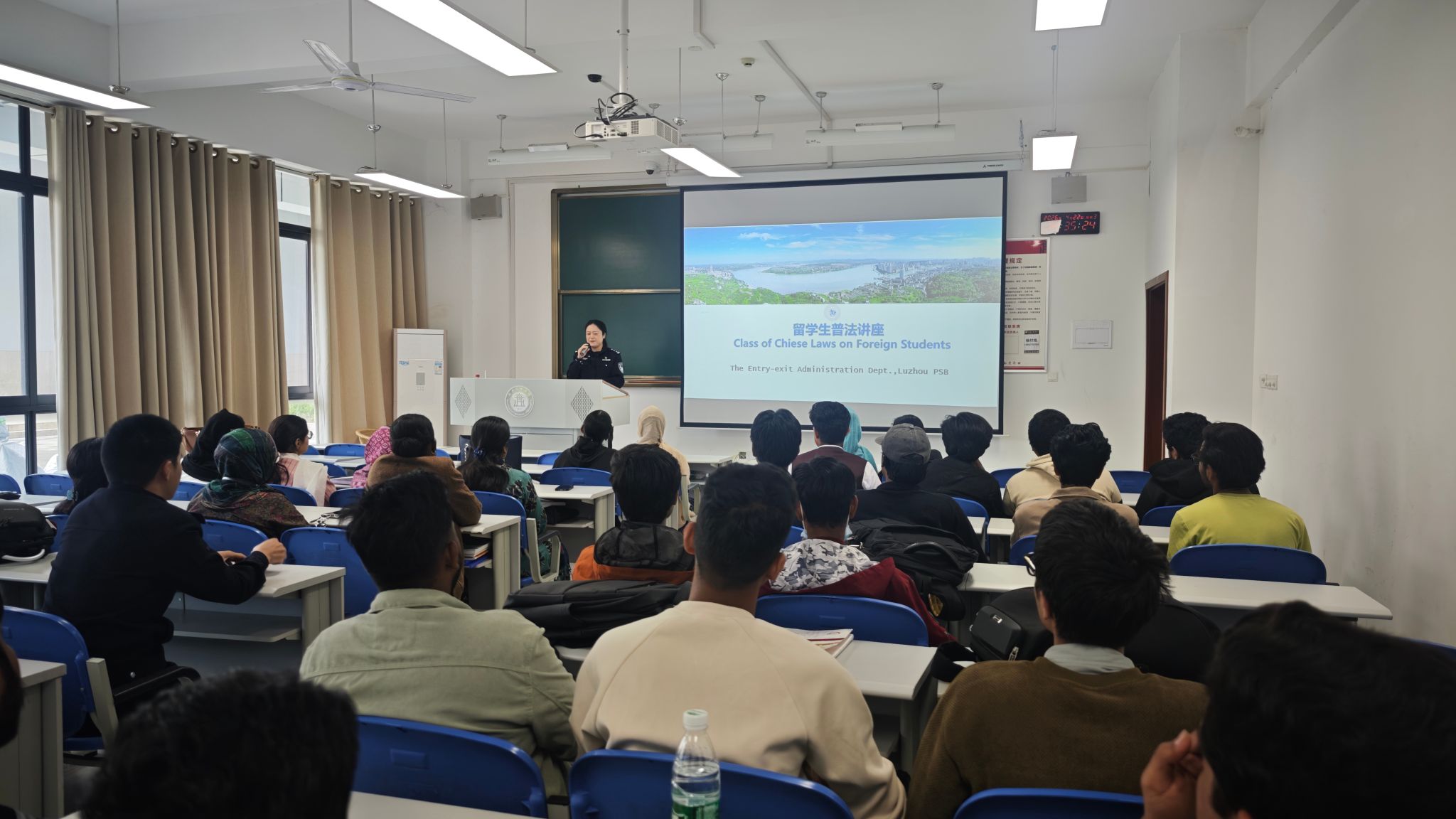 为增强来华留学生法治观念,规范其在华居留行为,4月22日下午,我校特邀泸州市公安局出入境管理支队张南娣警官,于文渊楼103教室为2025级留学生新生开展普法专题讲座。