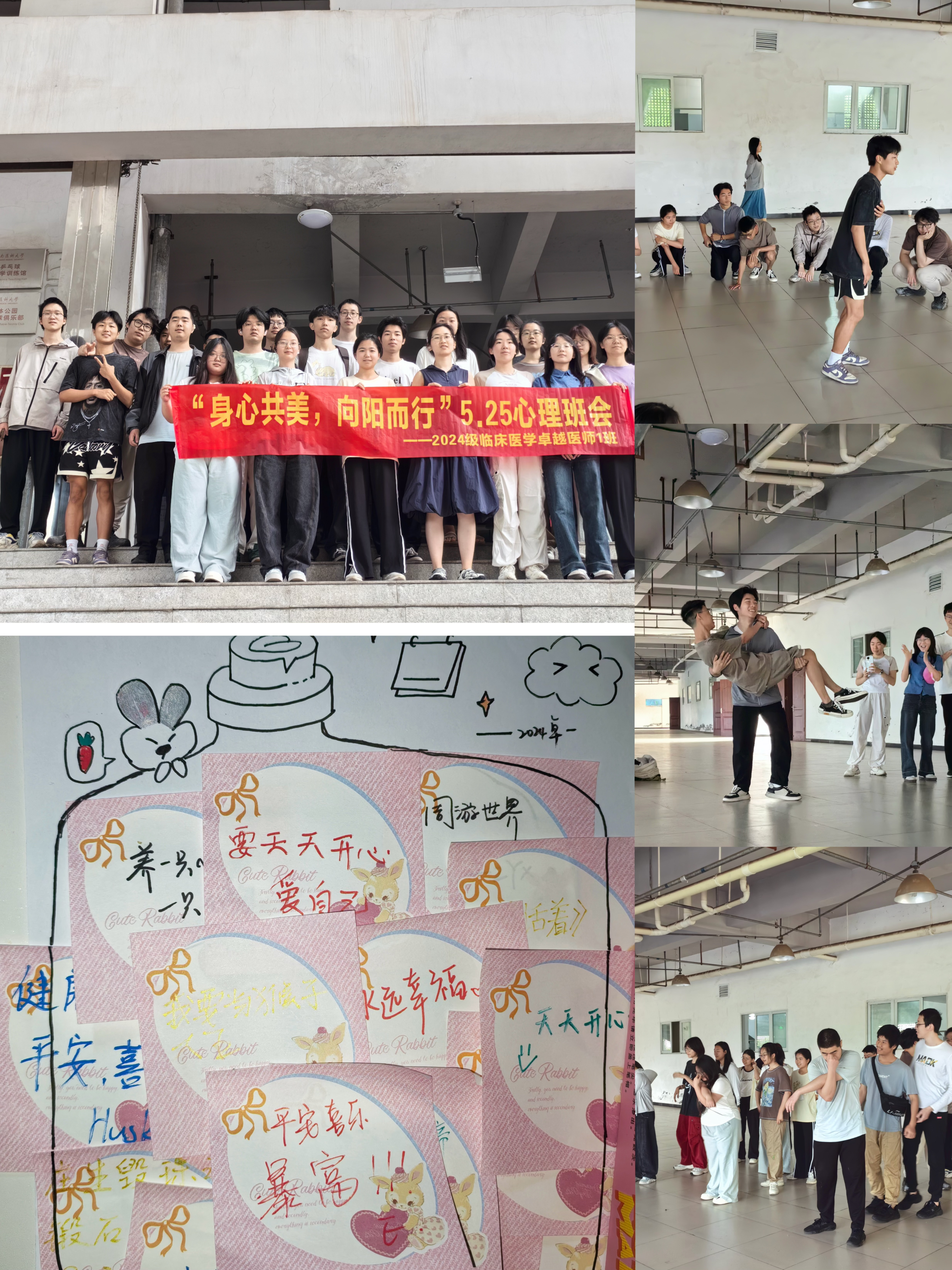 为增强班级凝聚力,关注学生身心健康,引导医学生树立积极向上的生活态度,4月26日,基础医学院2024级一办临床医学(卓越医师)1班在奥体中心开展了“身心共美,向阳而行”心理主题班会。本次班会由2024级一办副主任陈然、辅导员田艳指导,班级24名同学参与。