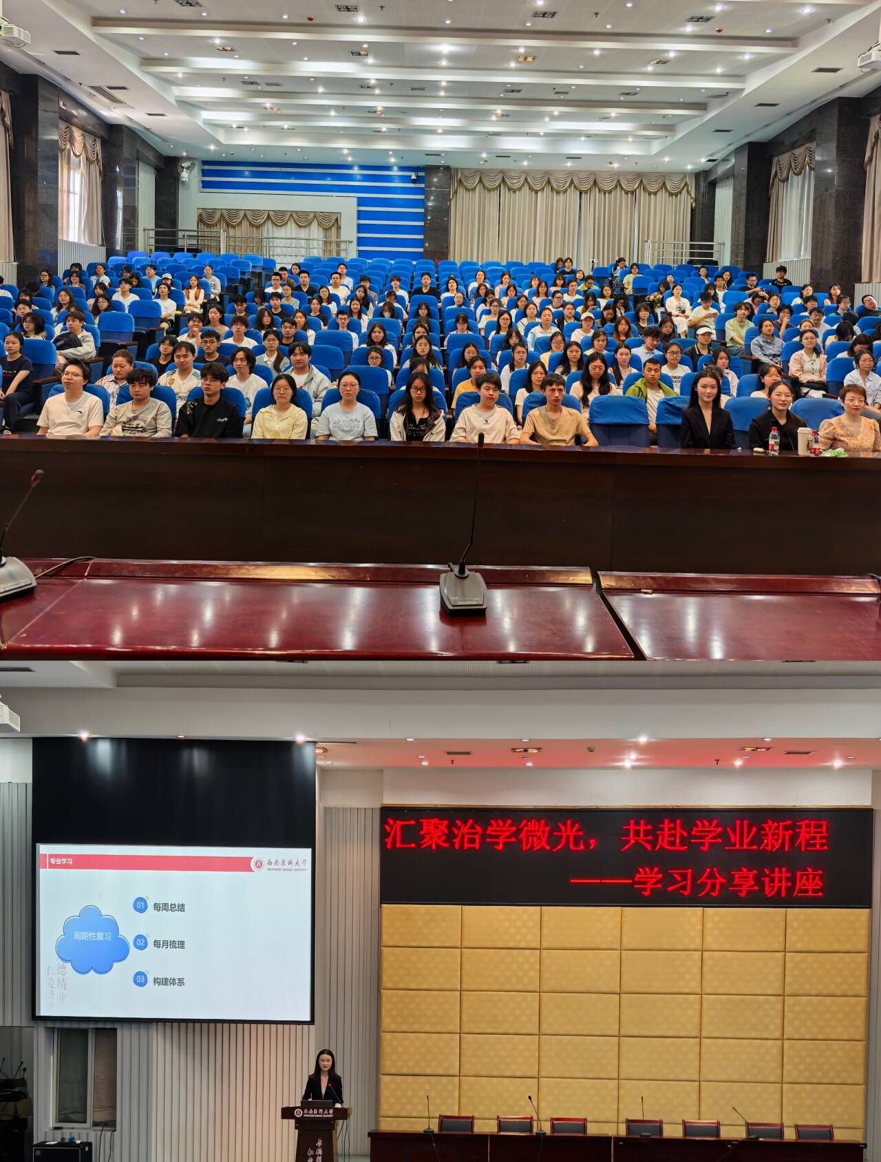 为引导同学们掌握高效学习技巧,破解医学课程学习难题,夯实学业基础,4月25日上午,基础医学院2024级一办在城北校区第二学术报告厅举办“汇聚治学微光,共赴学业新程”学习方法分享讲座。讲座由医学遗传学教师余红、2023级二办临床医学专业学生李蕊岐和杨知韵担任主讲,2024级一办辅导员田艳和200余名学生参加。