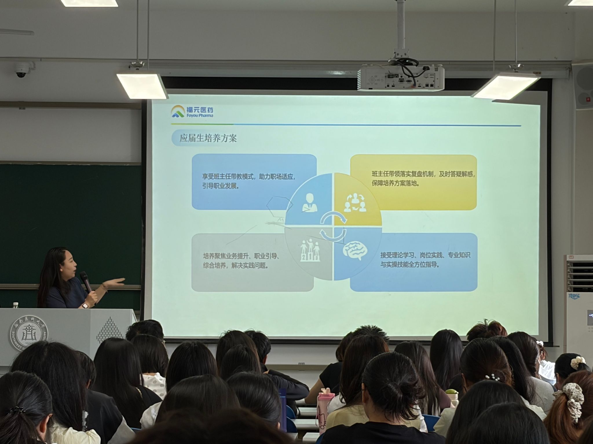 紧接着,韩镕灿围绕企业概况、企业文化、核心产品体系、岗位需求及人才培养体系等方面展开详细介绍。她以行业发展趋势为背景,深入解读了医药行业的人才需求标准,分享了福元医药的发展平台与成长路径,传递了企业“爱岗敬业、乐于奉献”的价值导向。同时,她也对简历制作、求职技巧等内容进行了指导,帮助同学们更好地适配企业招聘要求。