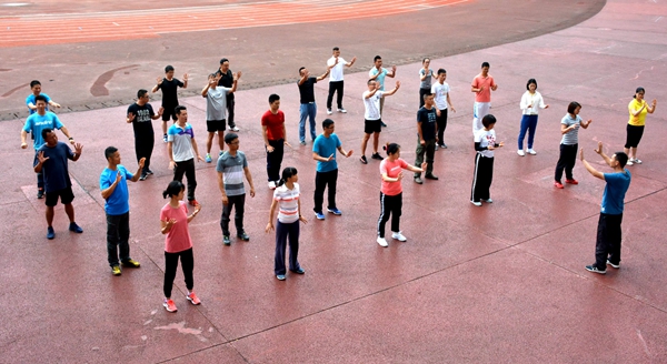 6月14日,由大学体育部承办的体育学院体育教师八段锦、易筋经培训会在奥体中心田径场举行,本次培训由体育学院马彪、庞宇老师主讲,张霞老师主持。