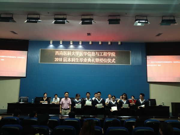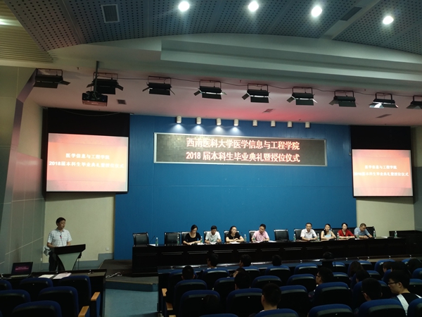 6月28日上午,医学信息与工程学院2018届本科生毕业典礼暨授位仪式在忠山校区学术报告厅举行。医学信息与工程学院党总支书记杨富华,院长尹德辉,副院长罗亚梅、潘宏,各科室负责人,教师代表及2018届全体本科毕业生参加了典礼。典礼由党总支书记杨富华主持。