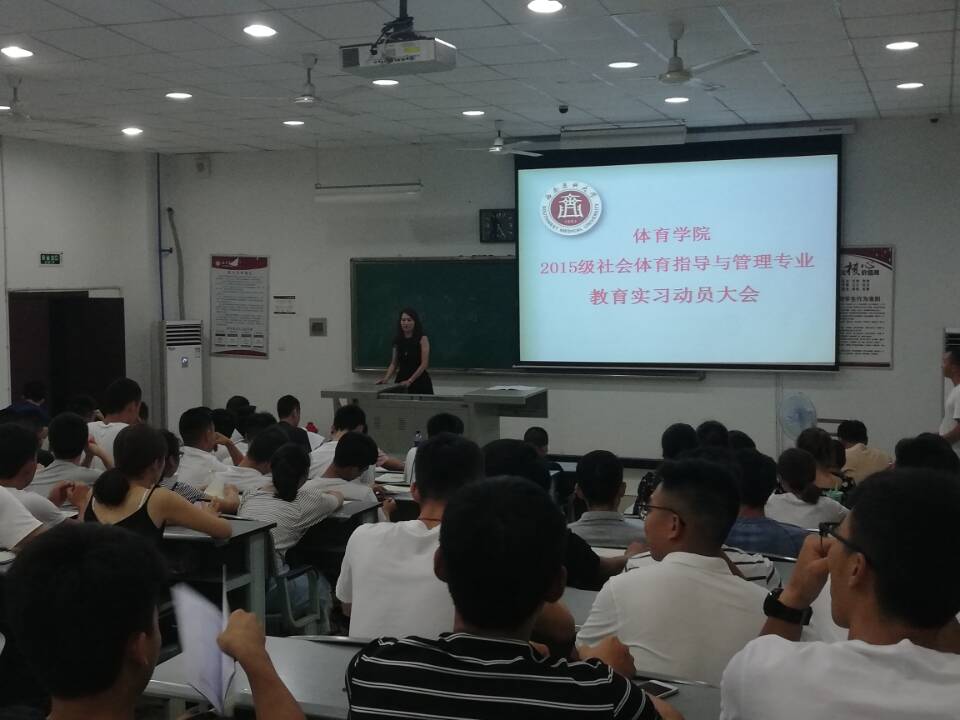 体育学院于9月5日晚18:30在海川楼413教室举行2015级实习生动员大会。体育学院党总支副书记何红媛、副院长王晓芳、学生科科长葛李、科教科辜山老师、学生科辅导员刘权和全体2015级实习学生参加了此次大会。会议由辜山主持。