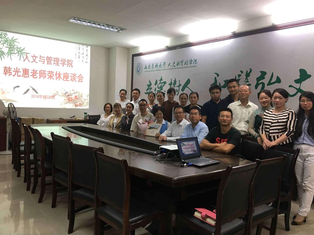 9月20日下午,人文与管理学院在学院会议室举行韩光惠老师荣休座谈会。会议由学院党总支副书记、工会主席陈屹主持,学院处科级干部、各教研室主任和医学人文教研部全体老师参加了此次座谈会。