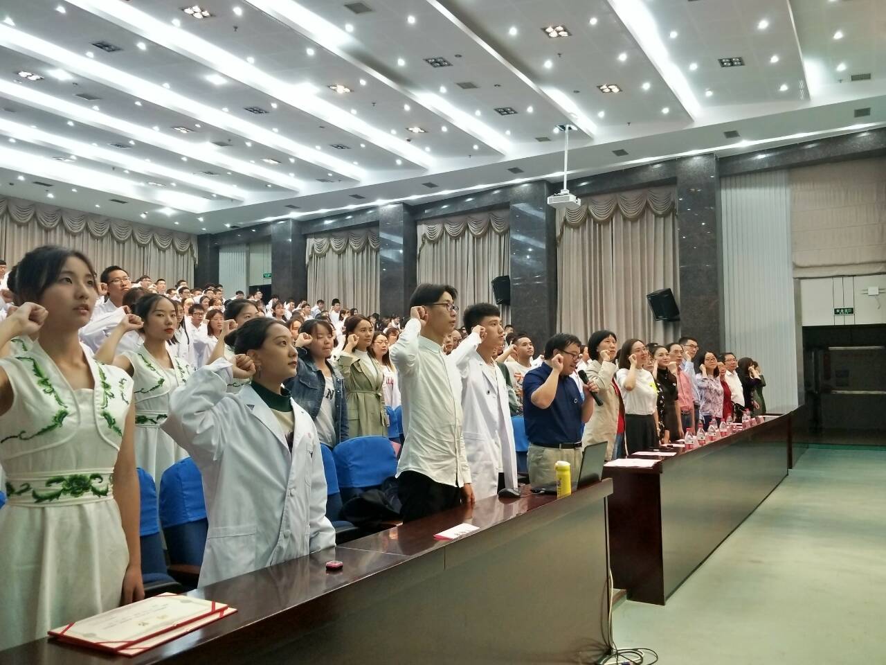 “大学生之大,不在于他的学年之长,而在于他具有肩负重任的能力和担当。”在党总支书记杨敏的带领下,全体师生起立,认真佩戴西南医科大学校徽,共同宣读:“从今天起,共享西南医科大学的荣耀,共担西南医科大人的责任”。这一刻,师生们无不深刻感受到作为一名医大人的责任和荣光。紧接着,董文斌教授用他那沉稳厚重、富含温暖的声音带领大家庄严宣誓,“健康所系,性命相托……”,一句句誓词都彰显出在场师生为祖国医药卫生事业的发展和人类身心健康奋斗终生的决心。