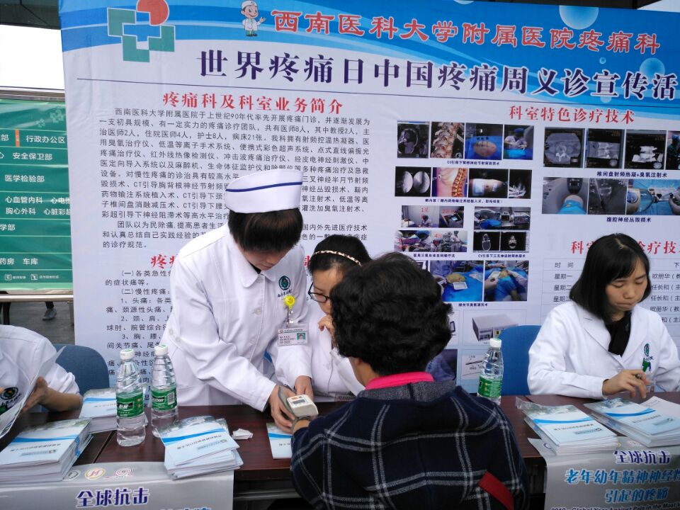 10月15日,附属医院疼痛科在医院门诊一楼大厅前举办“世界镇痛日”,义诊宣传活动,普及疼痛知识,引导市民科学镇痛。