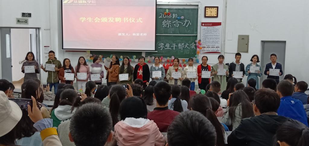 10月21日上午,基础医学院2018级综合办在明理楼203举行了学生组织成立大会。年级副主任杨笛、辅导员赵杨梦以及综合办全体学生干部参加了此次大会。会上,三大学生组织为同学们献上了精彩的表演,将会场气氛推向了高潮。团总支副书记、学生会主席、自律会主席分别宣读了团总支、学生会、自律会的章程和成员名单。随后,老师们给学生干部颁发了干部聘书,年级副主任杨笛进行了总结性发言,恭喜顺利通过面试的学生干部们,希望他们能起好带头作用,加强政治思想理论的学习和专业课的学习,平衡好工作和学习,不断提升自己的组织协调能力和团结合作的能力,努力增强大局意识、责任意识和奉献意识,端正工作态度,不断创新。