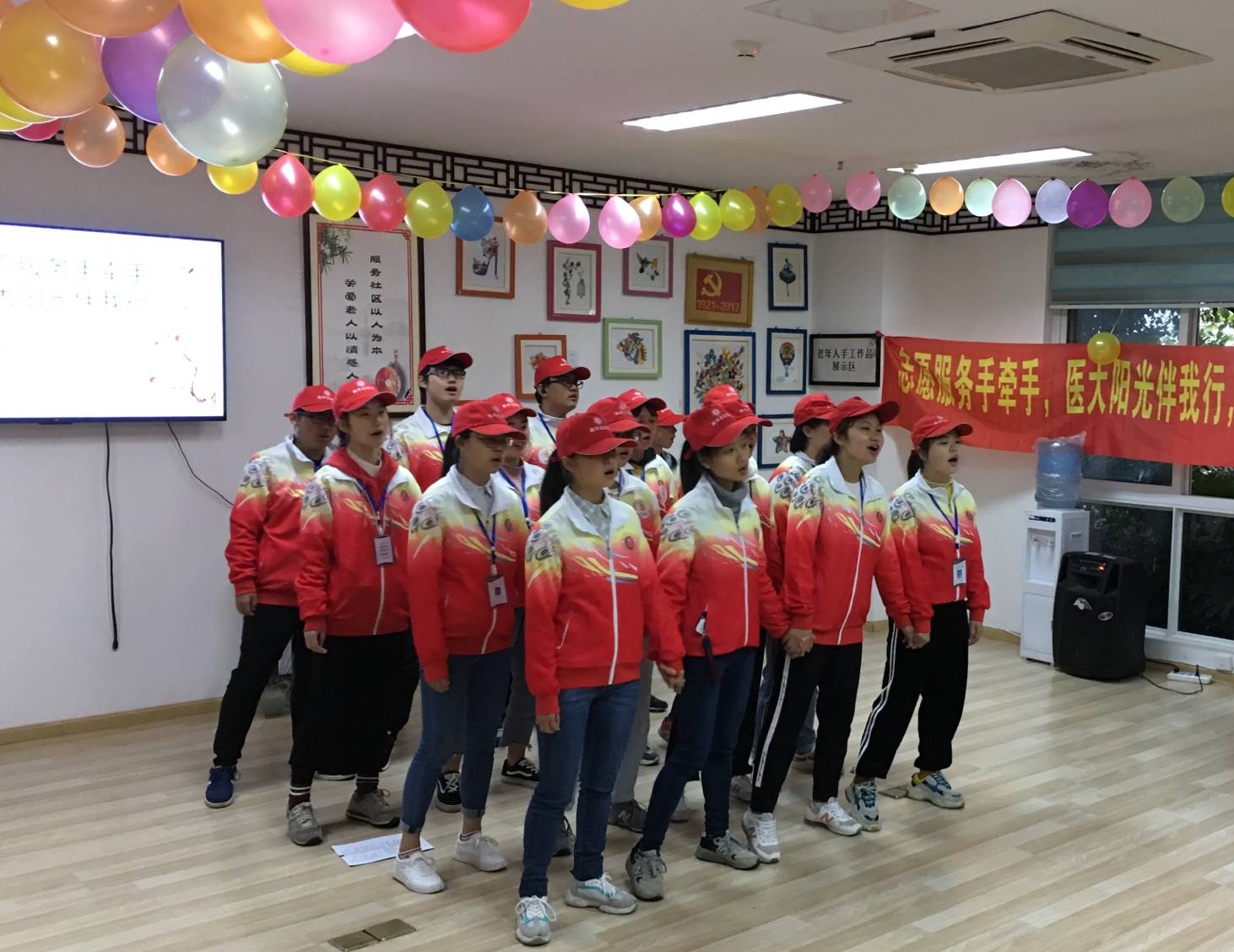 活动中,中西医结合学院的志愿者同学们充分运用所学的医学专业知识,为社区老年人分享了有关养生、防高血压、防诈骗的知识与技巧;还为社区老人表演了精心准备的节目,包括红歌串烧,太极拳的教授等。现场一片欢声笑语,洋溢着温馨幸福的气氛。最后,志愿者同学们为老人们送上了自己书写的对联、诗句和手工香囊,祝福老人健康长寿,幸福快乐!