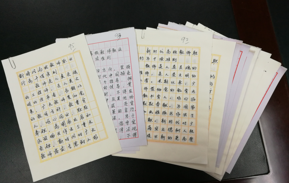 随后,支部还于11月26到30日开展了抄写准则的书法比赛。通过学习讨论抄写,支部成员进一步全面理解和准确把握准则,做到人人应知应做、必知必做,真正把教书育人和自我修养结合起来,时刻自重、自省、自警、自励,自觉做以德立身、以德立学、以德施教、以德育德的楷模,维护教师职业形象,提振师道尊严。