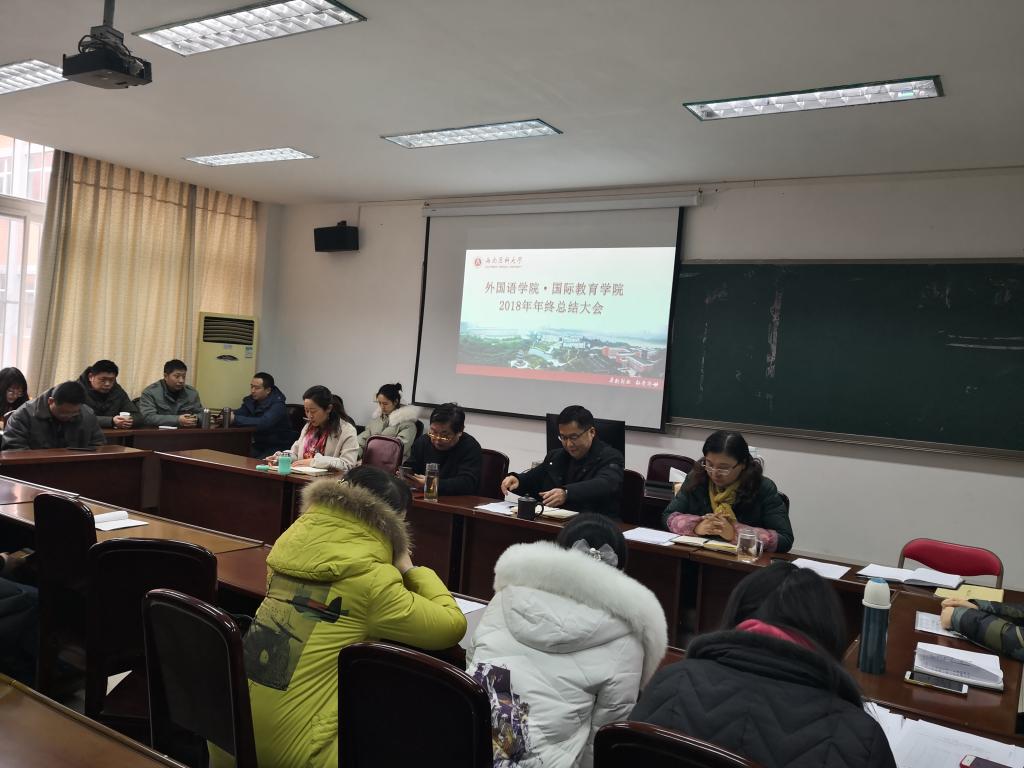 1月21日下午三点,外国语学院·国际教育学院在荟文楼二楼会议室召开学院2018年终总结大会,会议由党总支书记李昌平主持,学院全体教职工参加。
