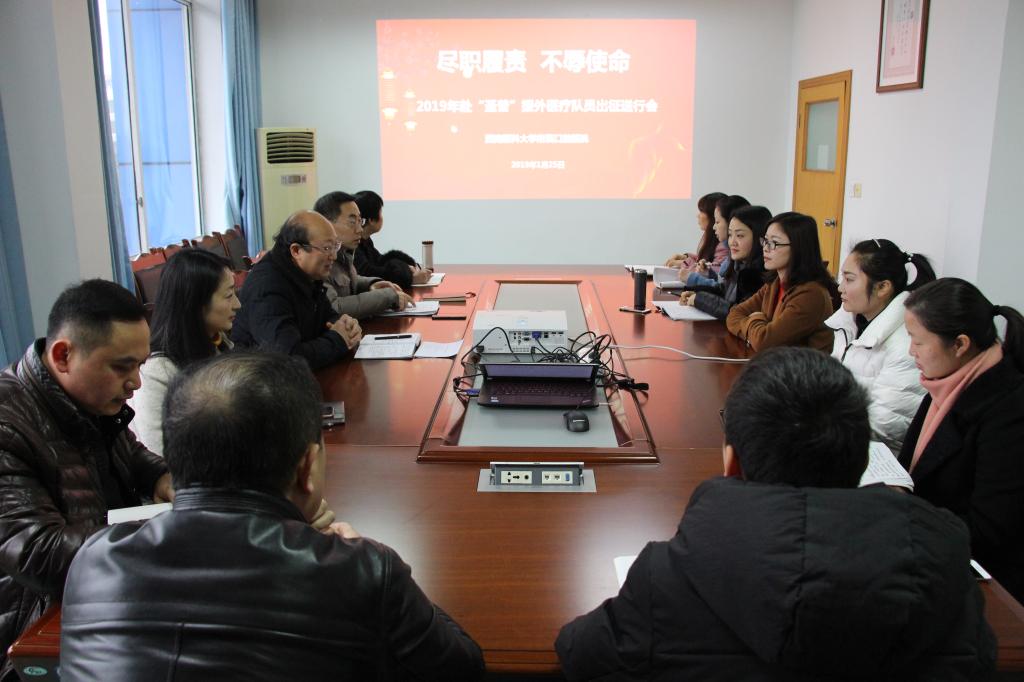 1月25日上午,附属口腔医院为即将奔赴“圣普”执行援外医疗任务的队员举行出征送行会,医院领导班子及相关职能部门负责人参加会议,会议由附属口腔医院党委书记李正新主持。
