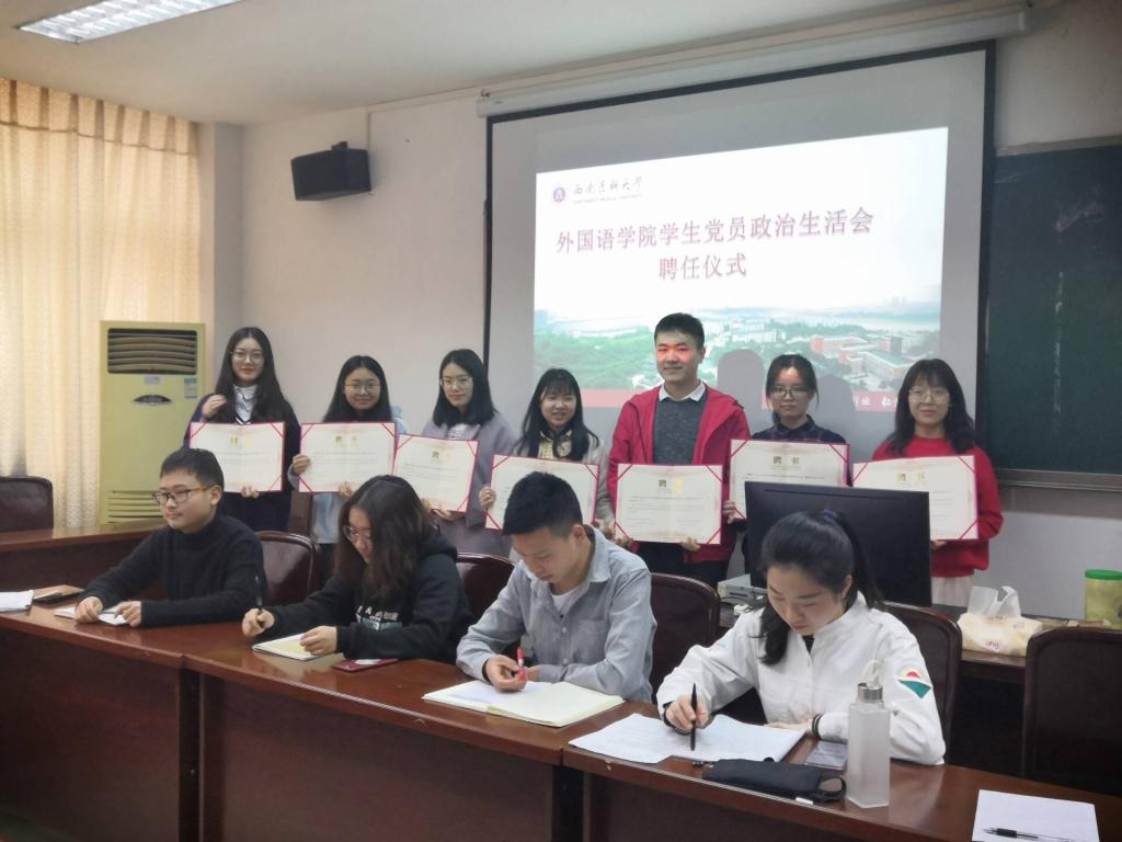3月26日,经外国语学院党总支同意,外国语学院学生党支部在学院会议室举行了学生党员政治班主任聘任仪式,本次会议由学生党支部委员邓天玲主持,2016级全体学生党员、分团委副书记以及各年级班长、团支部书记参加了聘任仪式。