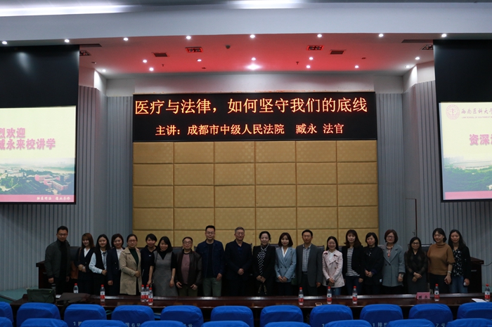 3月29日晚,由法学院、四川医事卫生法治研究中心、《医学与法学》编辑部、司法鉴定中心联合举办,医事法律研究会承办的“医学与法学”论坛第65讲在城北校区第二学术报告厅开讲。成都市中级人民法院臧永法官为我校师生作了题为《医疗与法律,如何坚守我们的底线》的专题讲座。法学院院长罗刚、明矩律师事务所的部分律师以及法学院全体师生聆听了讲座。