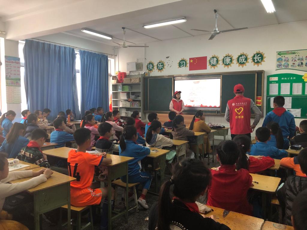 乘车半小时后,志愿者们来到了泸州市龙马潭区新民小学,开始了志愿活动宣讲。这次宣讲的对象是四年级的两个班,每个班分别指派了两名同学宣讲。在向小朋友讲述红色文化——长征精神时,小朋友们都十分积极热情,举手回答问题。经历这次活动后,小朋友们对红色文化也有了一些新的认识。