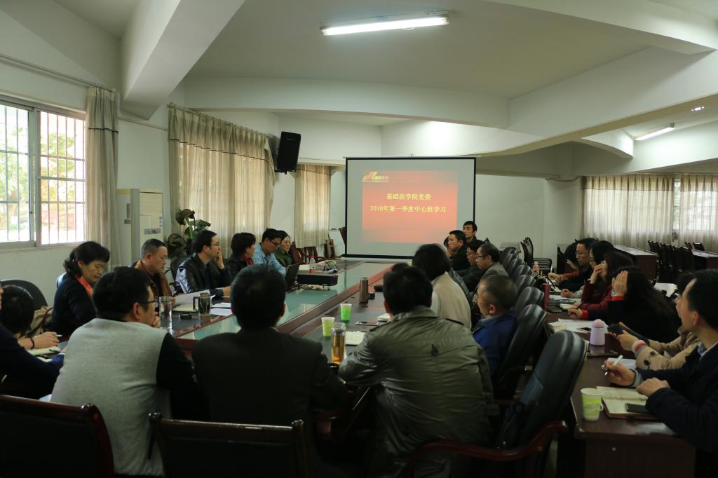 3月28日下午,基础医学院党委在基础医学院会议室召开了第一季度二级中心组集中学习。学院两委委员、处科级干部、科室主任、支部书记参加了会议。会议由学院党委书记赵珍先主持。