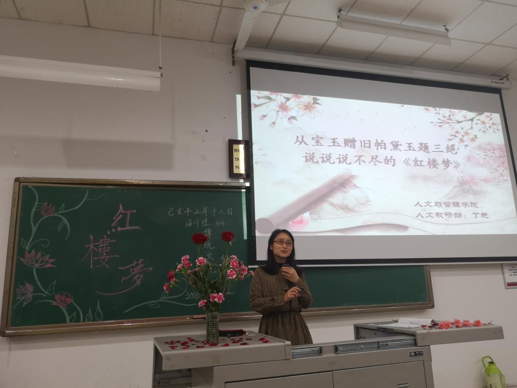 4月20日晚,人文与管理学院人文教研部丁艳副教授在海川楼314室作了题为《从宝玉赠旧帕黛玉题三绝,说不尽的〈红楼梦〉》的专题讲座。