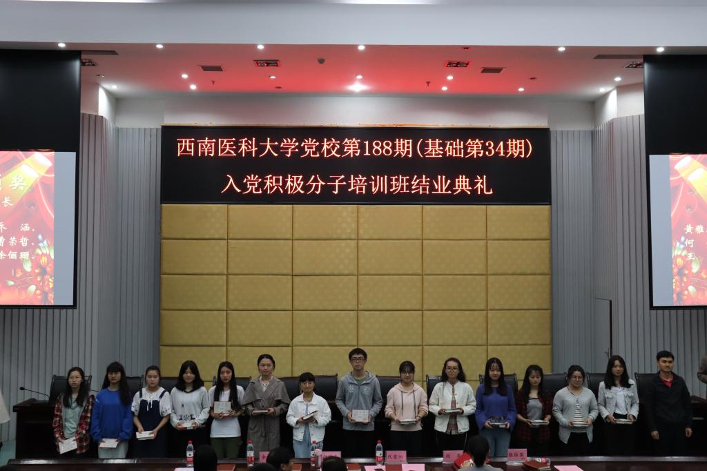 接着,基础医学院院长代荣阳宣读了表彰决定,然后由党校校务委员及指导老师为28名优秀学员、12名优秀心得体会获得者及12名优秀读书笔记获得者颁奖。