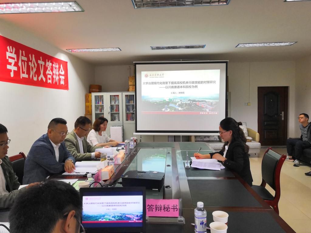 答辩会上,钟琳莉、何龙、吴琴琴、江一凡、何泳璇5名同学分别以《大学治理现代化背景下的高校机关行政效能研究》《L市吸毒人员网格化服务管理研究》《泸州市市管三级甲等公立医院后勤管理现代化研究》等为题进行论文答辩。5名同学详细阐述了自己毕业论文的选题、主要内容、研究方法及创新点。答辩委员们严格把关,认真审阅论文,他们对同学们毕业论文的研究方法、研究内容、参考文献等进行了详细提问,并指出其中不足及修改意见。同学们认真倾听,对答辩委员们的提问进行了一一回答。最终,经过答辩委员会休会讨论,答辩委员会主席陈一君教授宣布参加此次答辩的5名同学顺利通过答辩,其中何龙同学的论文成绩评定为优秀。