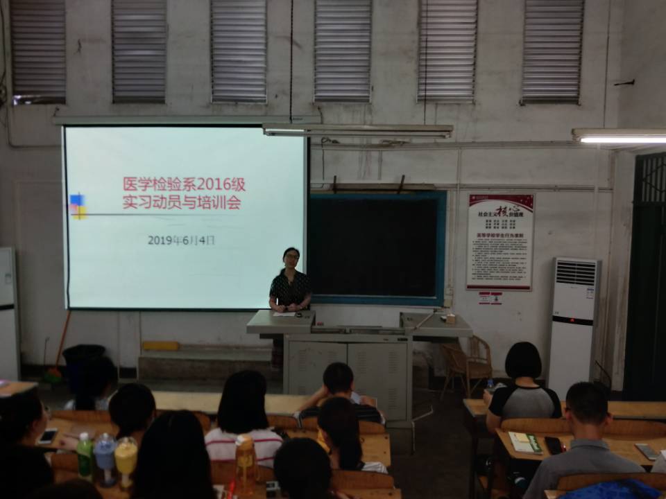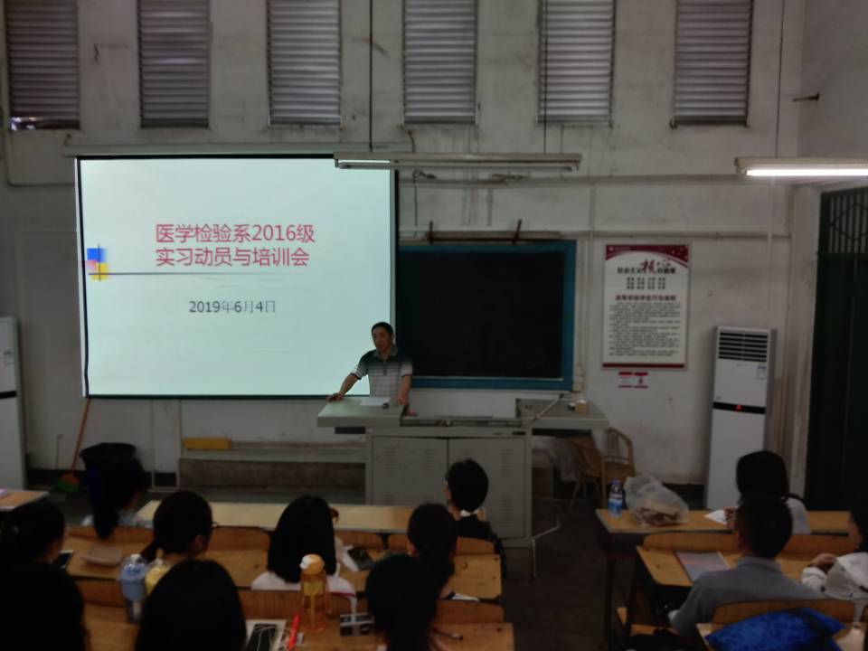 6月4日上午,医学检验系在忠山10阶教室举办了“2016级实习动员与培训会”。医学检验系主任陶华林、医学检验系党总支书记黄君、医学检验系党政办公室主任李咏、辅导员何顺姣、2015级学生周希月和陈清林,以及2016级全体学生参加了会议。