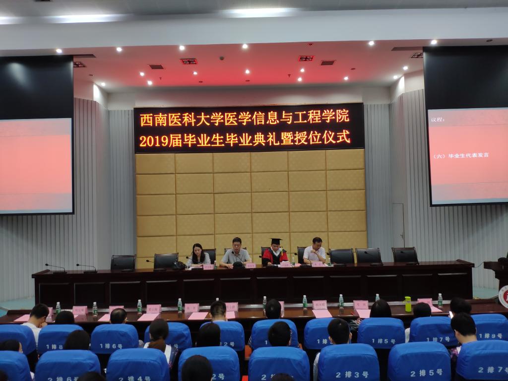 6月27日上午,医学信息与工程学院2019届本科生毕业典礼暨授位仪式在城北校区第二学术报告厅举行。医学信息与工程学院党总支书记杨富华,院长尹德辉,副院长罗亚梅、潘宏,各科室负责人,教师代表及2019届全体本科毕业生参加了典礼。典礼由杨富华主持。