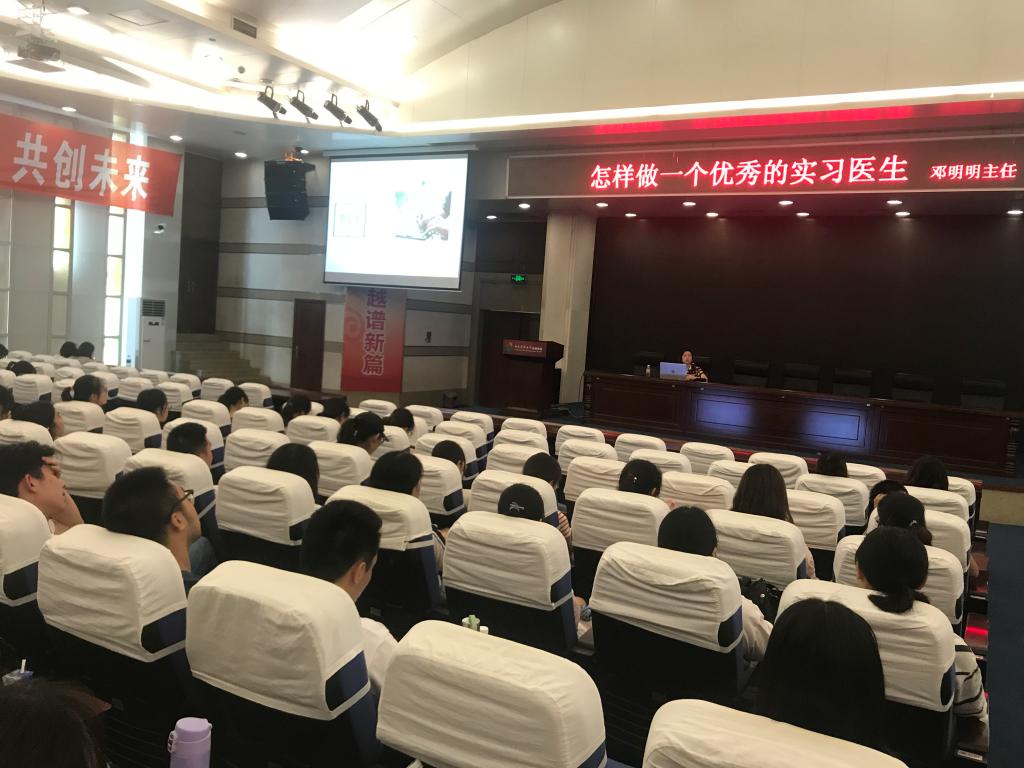 近日,由附属医院开展的以“怎样做一个优秀的实习生”为主题的实习培训讲座在附属医院外科大楼五楼学术报告厅成功举行。本次讲座由附属医院消化内科邓明明主任担任主讲,附属医院全体实习生聆听了讲座。