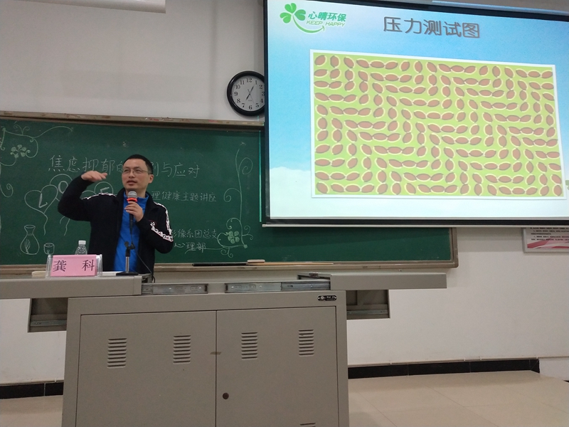 讲座上,龚科通过压力测试图及典型心理案例调动了学生们的积极性,强调健康生活的标准以及情绪的重要性,引起学生们对身心健康的重视。接着剖析现代大学生常见的心理问题,分析问题产生的原因,并就一些普遍的心理问题提出了自我调适的方法。在互动环节中,龚科耐心细致地解答大家的问题,为学生们的心理困惑送上一剂良药。