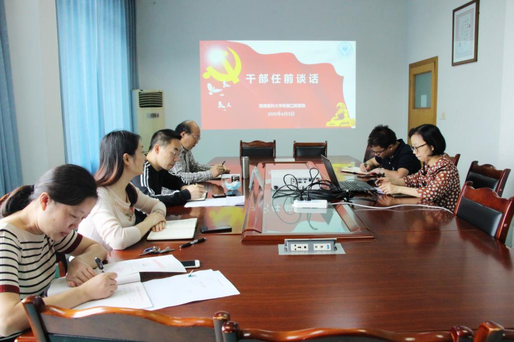 6月3日上午,附属口腔医院召开干部任前谈话会,对口腔颌面外科(门诊)副主任何芸、颞下颌关节副主任冯浩进行任前谈话。附属口腔医院党委书记李正新、院长肖金刚、党委副书记兼纪委书记徐茜、组织人事科科长郭世莉参加会议,与何芸、冯浩交心谈心,明要求,提希望。会议由李正新主持。