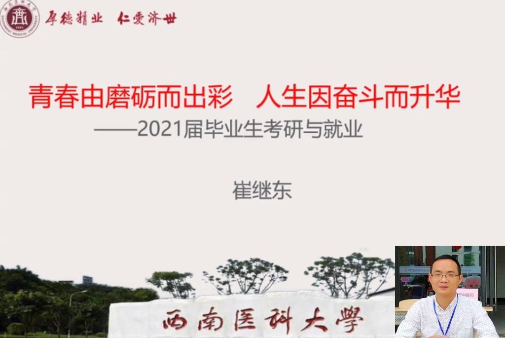 9月28日晚,由西南医科大学临床医学院学生工作部主办的“成长之路”大讲坛“医路筑梦”系列之“问渠——考研与就业漫谈”在钉钉平台直播开展。学校就业办公室主任崔继东作为本次讲座主讲人,围绕学子毕业以后该如何选择自己的未来道路的问题,从考研和就业两个方面进行了剖析,参与人数达1600多人。