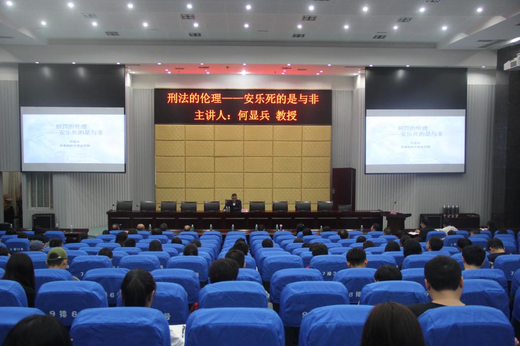9月27日晚,由我校法学院、四川医事卫生法治研究中心、《医学与法学》编辑部、西南医科大学司法鉴定中心共同主办的西南医科大学法学专业创办20周年系列学术讲座暨“医学与法学”论坛第八十六讲,邀请到西南科技大学法学院副院长、我校法律硕士研究生兼职导师何显兵教授,在城北校区第二学术报告厅作了题为“刑罚的伦理——安乐死的是与非”专题讲座。学校副校长何涛、泸州市司法局副局长何玉兰、法学院全体师生、部分校友以及实务部门的有关专家参加了本次讲座。讲座由法学院副院长先德奇主持。