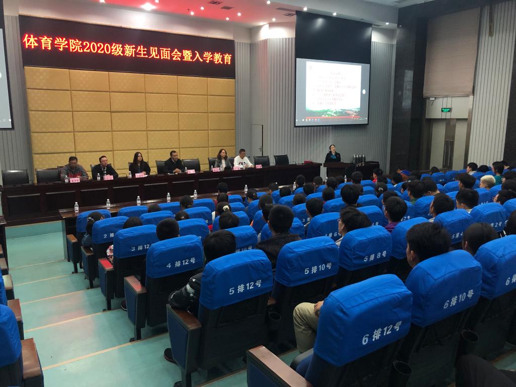 1021日晚,体育学院在逸夫图书馆第二学术报告厅举行2020级新生见面会暨入学教育。体育学院党政班子成员、各科室负责人、各系部主任及2020级兼职班主任参加了会议。会议由体育学院党总支副书记何红媛主持。
