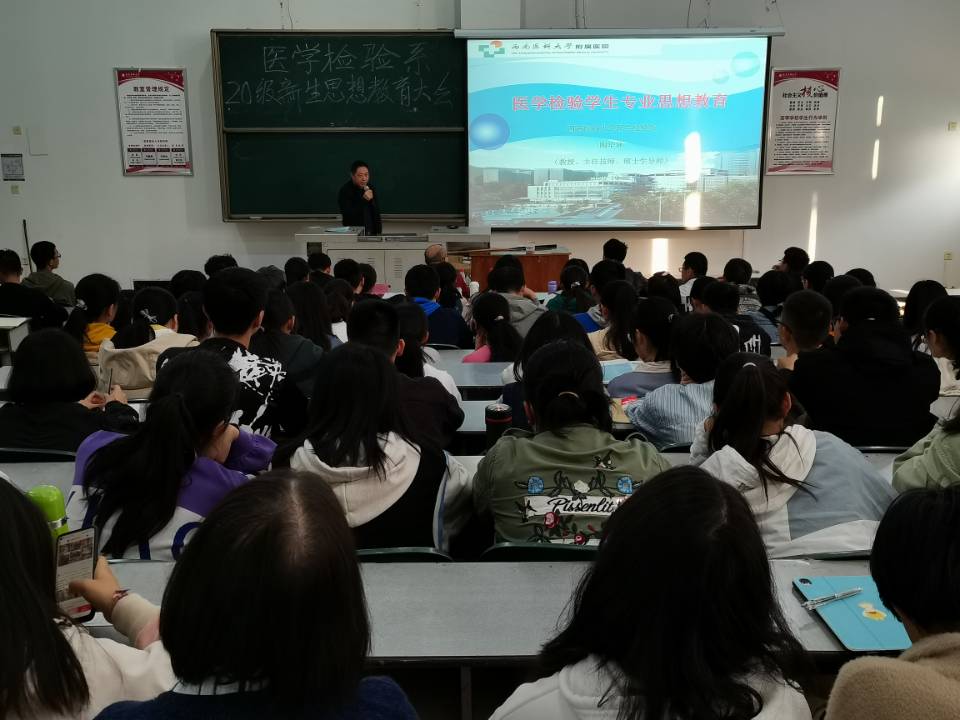 10月22日下午,医学检验系邀请原系主任陶华林教授、输血科张洪为老师为2020级全体同学在荟文楼203教室进行专业思想教育,由系学生科副科长何顺姣主持。