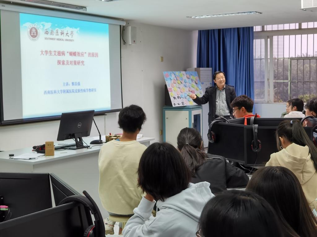 10月30日,外国语学院新生艾滋病防治宣传教育讲座在荟文楼306教室举行,此次讲座由学校艾滋病防控领导小组成员、附属医院皮肤科教授黎昌强指导和提供宣教资料,外国语学院院长田耘担任主讲人,2020级英语专业全体新生参与。