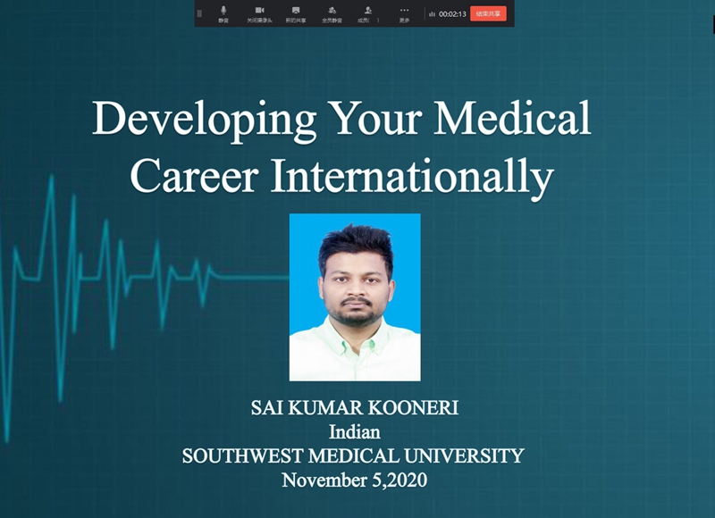 11月5日下午,由对外联络处与国际教育学院联合主办的第二十六期“校友讲坛”开讲。由于疫情影响,本期“校友讲坛”采取线上直播的形式进行。本期“校友讲坛”由我校MBBS专业毕业留学生2013级印度籍校友SAI KUMAR KOONER和2014级印度籍校友KRISH SAHOO主讲。SAI KUMAR KOONER于2013至2019年在西南医科大学学习临床医学专业。一次性通过FMGE(印度国外医学毕业生考试)后,现于印度喀拉拉邦BEACH HOSPITAL CALICUT实习。KRISH SAHOO 于2014至2020年于西南医科大学学习临床医学专业,一次性通过FMGE(印度国外医学毕业生考试)后,成功申请到印度克塔克邦的SCB MEDICAL COLLEGE实习。在会议的开始,国际教育学院院长陈勤进行了讲话,对因疫情回国的留学生表达了关心和慰问。国际教育学院全体师生共300余人聆听了讲座,讲座由国际教育学院李雪茹科长主持。