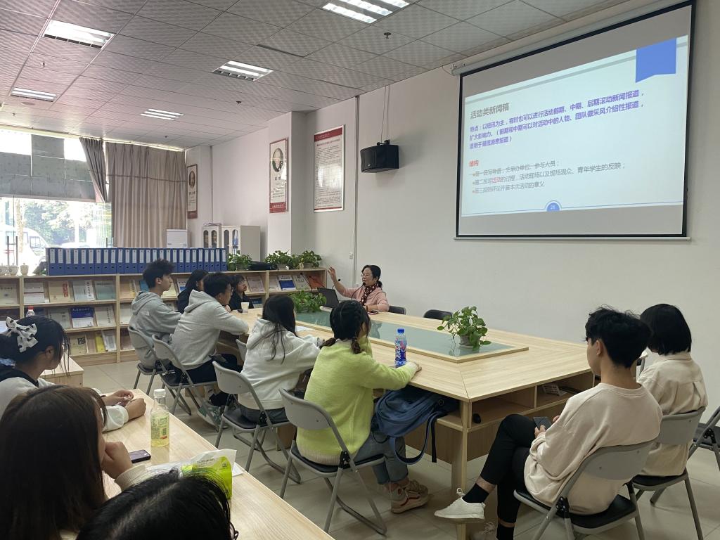 在培训会上,黄莉从新闻写作的要素,校园新闻的分类、新闻图片的采集、投稿排版的规范等四方面进行讲解,并强调新闻稿的时效性与真实性,并列举了新闻实例以作详细讲解。