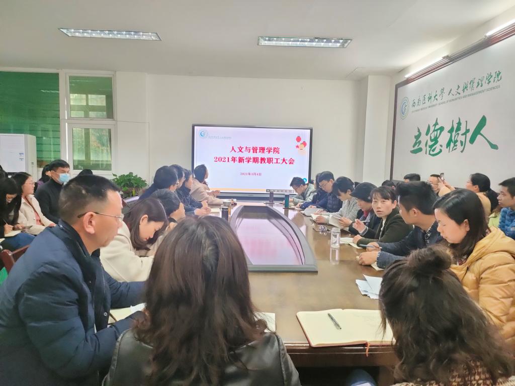 为做好新学期开学准备和新学年整体工作部署,3月4日,人文与管理学院全体教师在学院办公室召开新学期教职工大会,会议由该院院长赵成文主持,学院全体教师参会。