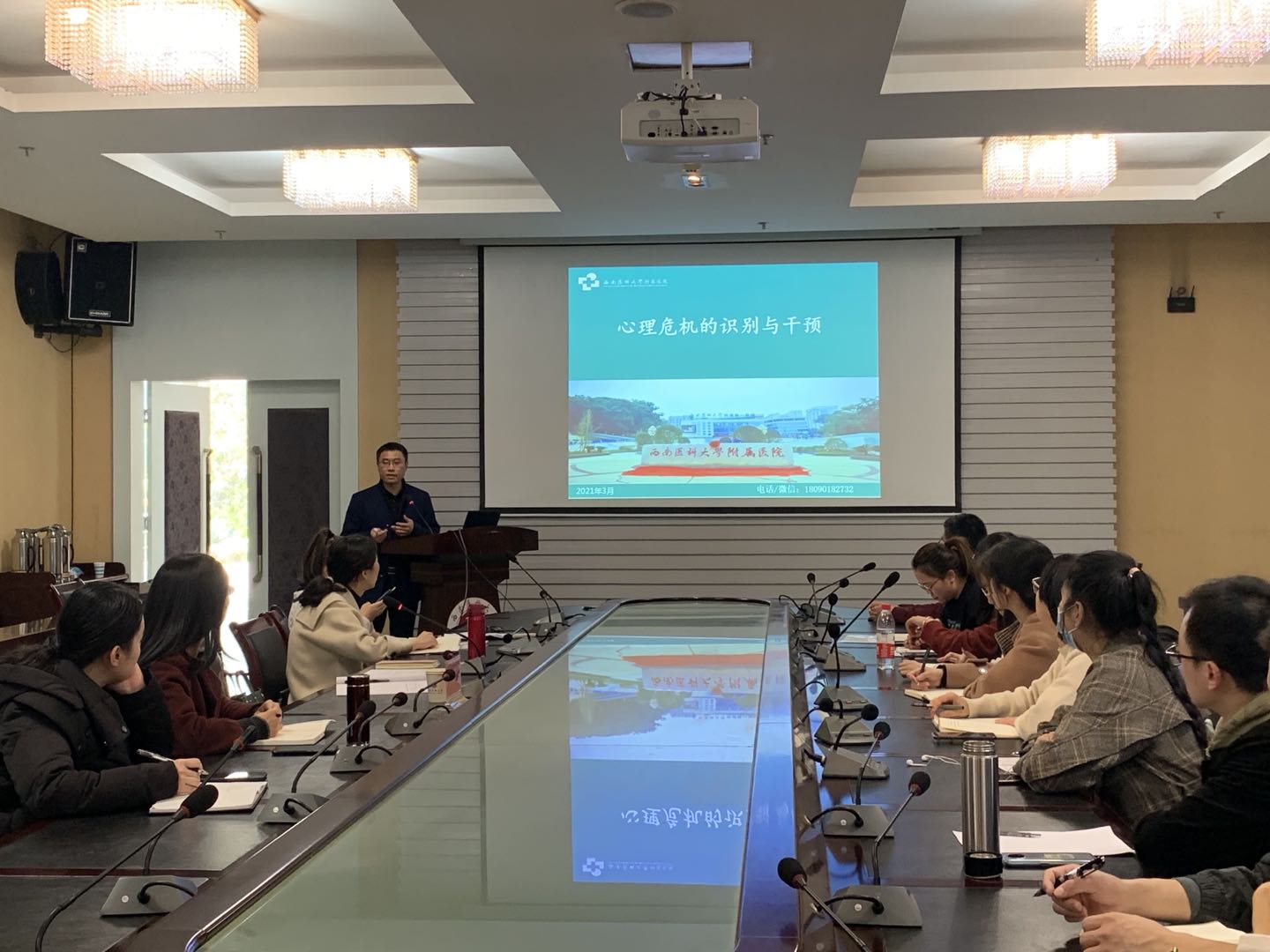 为做好学生心理危机的识别及干预工作,有效预防校园心理危机事件的发生,3月23日下午,基础医学院邀请该学院心理健康辅导站指导教师、西南医科大学附属医院心身医学科主任刘可智教授开展“大学生心理危机的识别与干预”专题培训讲座。基础医学院党委副书记黄钰、外国语学院党总支副书记邓盛木、基础医学院全体专兼职辅导员、各院系辅导员代表共计40余人参加了培训会。会议由基础医学办副主任王旭利主持。