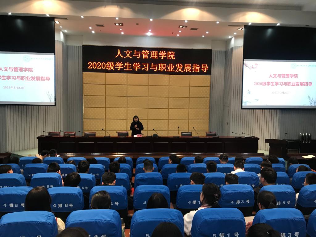 人文与管理学院2020级学生为大类招生,为解答2020级学生对专业分流、学业与职业发展等方面存在的疑惑,明确学习方向,3月23日下午,人文与管理学院在城北校区第二学术报告厅开展了题为“2020级学生学业与职业发展指导”的讲座,本次讲座由人文与管理学院党总支副书记马俊主讲,学生科副科长陈旭主持,全体辅导员、兼职班主任及2020级学生参加了讲座。