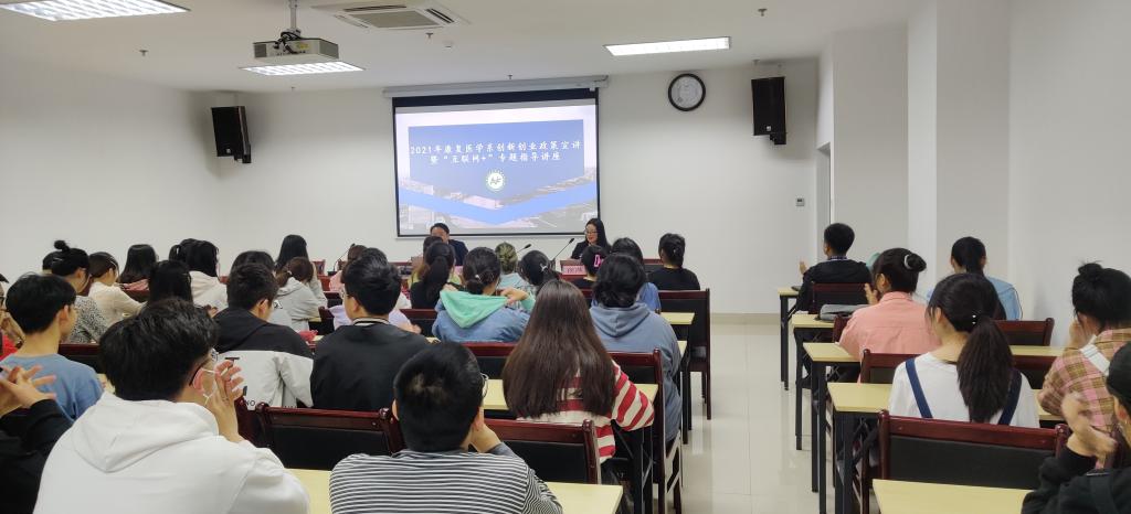 邓睿讲解了大学生创新创业的重要意义,传达了党中央国务院、教育部等部门关于大学生创新创业活动的要求,深入分析了大学生创新创业的各项活动,形象生动地向同学们讲解了各类大学生创新创业比赛的具体要求以及参赛细节,向同学们分享了优秀的案例。随后,康复医学系何帅与同学们分享了自己参加各类创新创业竞赛的宝贵经验,详细讲解了“互联网+”大赛规则和申报技巧。侯萍结合康复医学系实际情况,向同学就大学生涯规划等给予建议,勉励同学们要学会合理分配时间,做好学习和工作的平衡,积极参加各类校园文化活动,提升个人专业技能和综合素质。