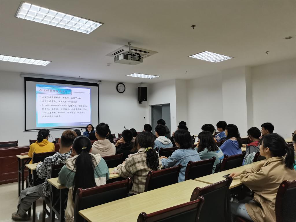 讲座中,张开莲以中央电视台《对话——创新药破冰》节目为切入点,讲述了全球及我国药学行业的状况,指出新药开发存在过程艰辛、耗时漫长、前期投入大、风险高等困难,以及药学行业在癌症以及精神类疾病等特效药制备上处于瓶颈期。她提到,作为药学人,新药开发的重任将落在在座的后辈肩上。