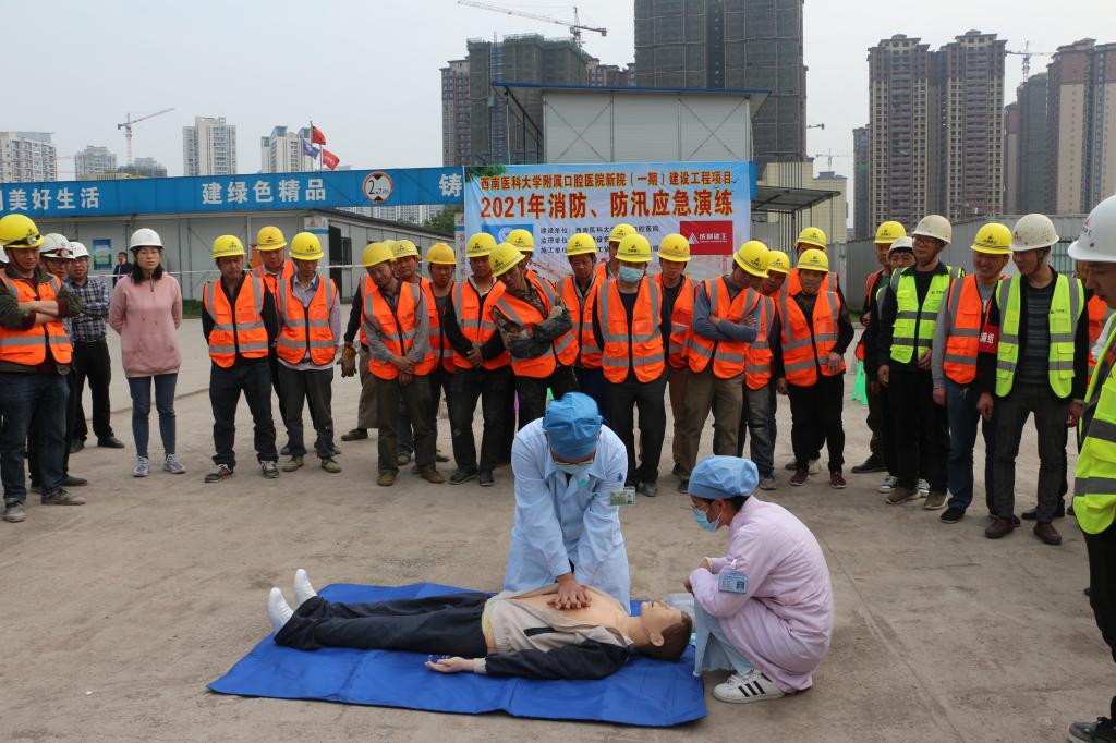 西南医科大学附属口腔医院新院(一期)建设工程项目部为进一步强化应急预案保障措施的落实,提高新院建设项目参建单位各级人员部应对安全生产事故和突发性事件的能力。4月13日下午,新院建设项目部组织各施工参建单位的管理人员、班组长、工人代表在工地现场开展了逃生自救互救、消防和防汛综合应急演练。此次应急演练邀请了政安消防特级教官田光华、江阳区住建局安全监督办公室主任赵永莅临现场进行指导,医院党委书记代天祥、副院长屈进参加应急演练,应急演练总指挥由代天祥担任。