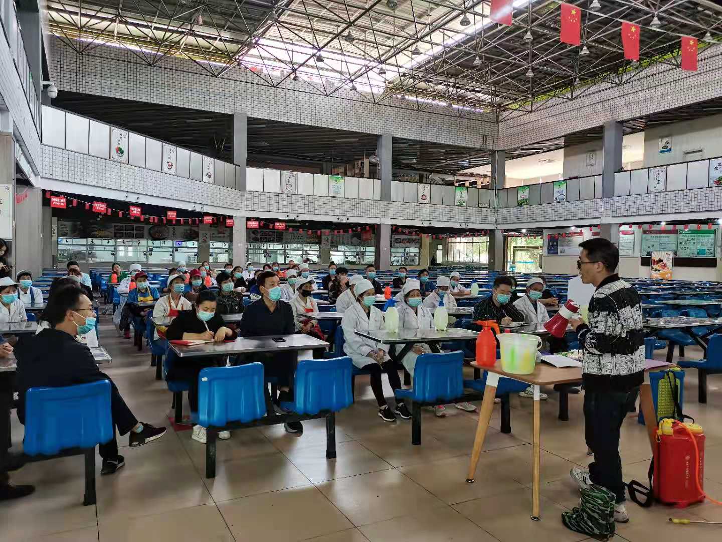 为进一步做好学校常态化的疫情防控工作,让干部职工克服麻痹思想和松劲心态,4月26日下午,基建后勤处在桂香苑食堂一楼组织召开了一次消毒防疫技能知识专题培训会,培训会由基建后勤处副处长刘平主持,学校食堂、学生公寓和物业管理公司约30余名消毒人员参加了培训。