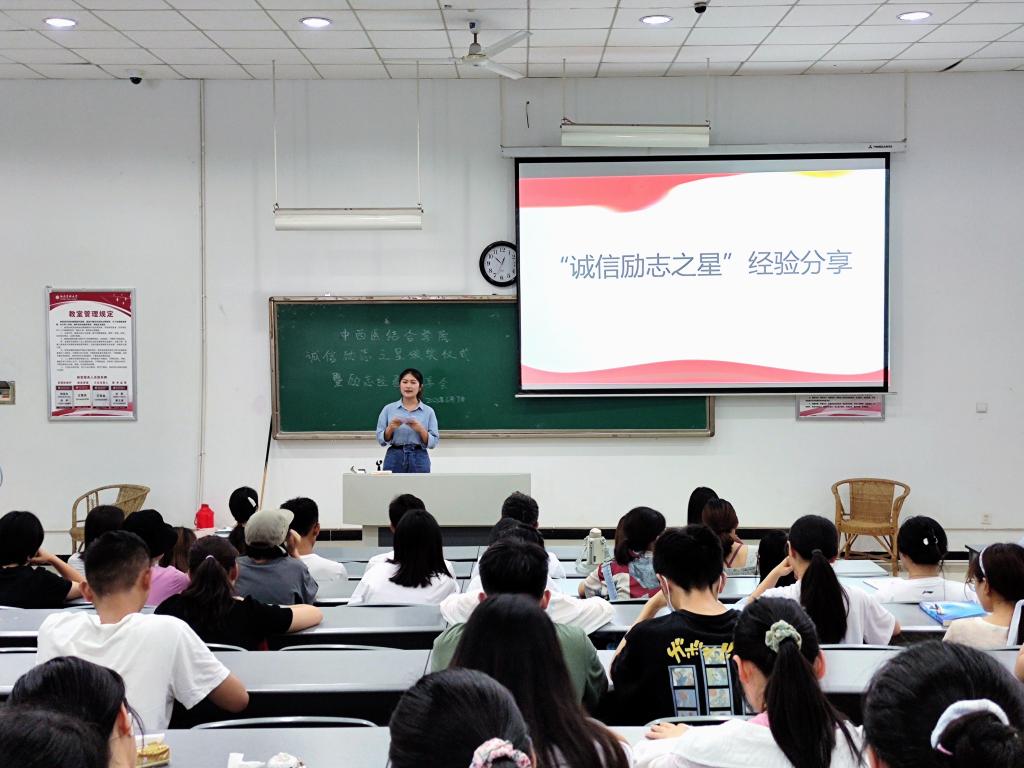6月7日中午,由西南医科大学中西医结合学院举办的“诚信励志之星”颁奖仪式暨励志经验分享会在海川楼514教室召开。学院学生科科长谢晓东、资助工作管理专员杜薇与中西医结合学院各年级同学代表200余人参加了此次颁奖仪式及分享会。