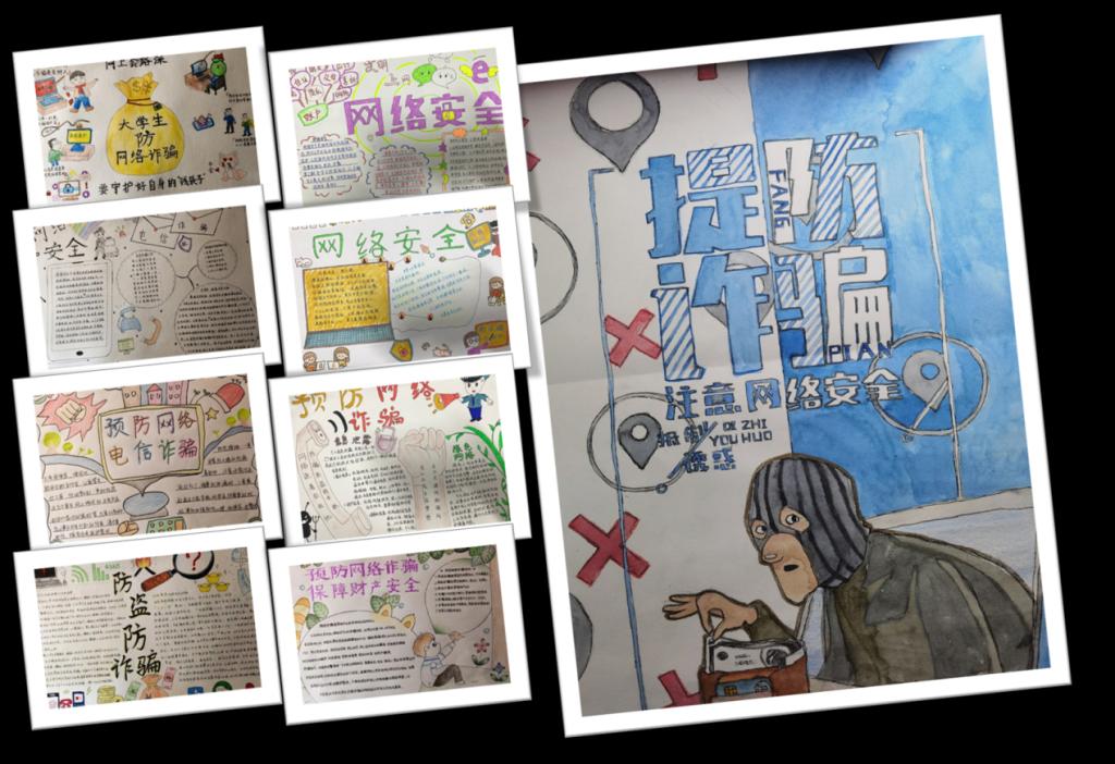 本次活动以制作宣传画形式来展示“防范网络诈骗”相关知识。活动中同学们积极参与,共收到25个参赛作品,作品充分表达了同学们对“网络诈骗”的认识以及预防诈骗知识,经过评选,最终选出优秀作品9份,活动对获奖者进行了表扬奖励。
