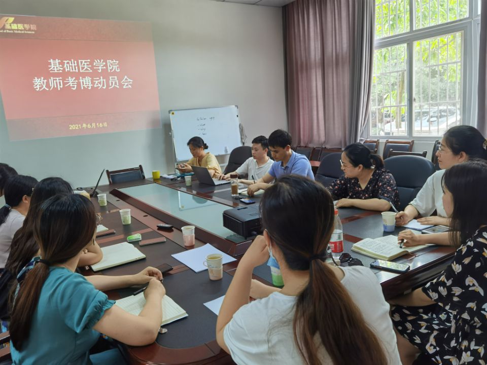 为提高年轻教师培养质量,为教师办实事,给年轻硕士学位教师提供全方位的考博动员和指导,6月16日下午,基础医学院在鸿文楼小会议室举办了基础医学院教师考博动员暨经验交流会,学院院长代荣阳、副院长曾永秋、附属医院影像科胡伟博士、基础医学院肿瘤研究所蔺艳博士以及9名具有硕士学位的年轻教师参加了本次会议,会议由曾永秋主持。