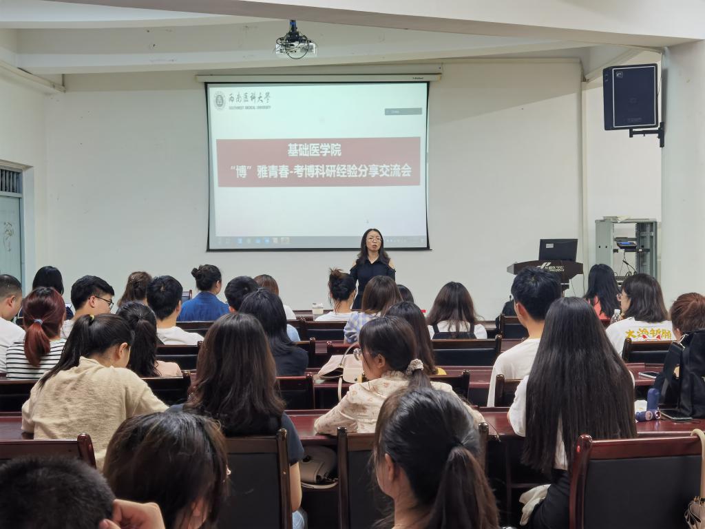 为了提高人才培养质量,激发广大硕士研究生考博的热情,6月24日晚,基础医学院在鸿文楼一楼大会议室举办了“博”雅青春考博科研经验交流会,邀请了两位2018级考取博士研究生的优秀学生代表向建全和胡佳佳分享科研心得及考博经验。基础医学院党委书记阳静、学科建设办公室副主任王译伟、研究生兼职辅导员蒋洁以及基础医学院全体2019级、2020级硕士研究生参加了本次交流会。会议由2020级硕士研究生陆瑞林主持。