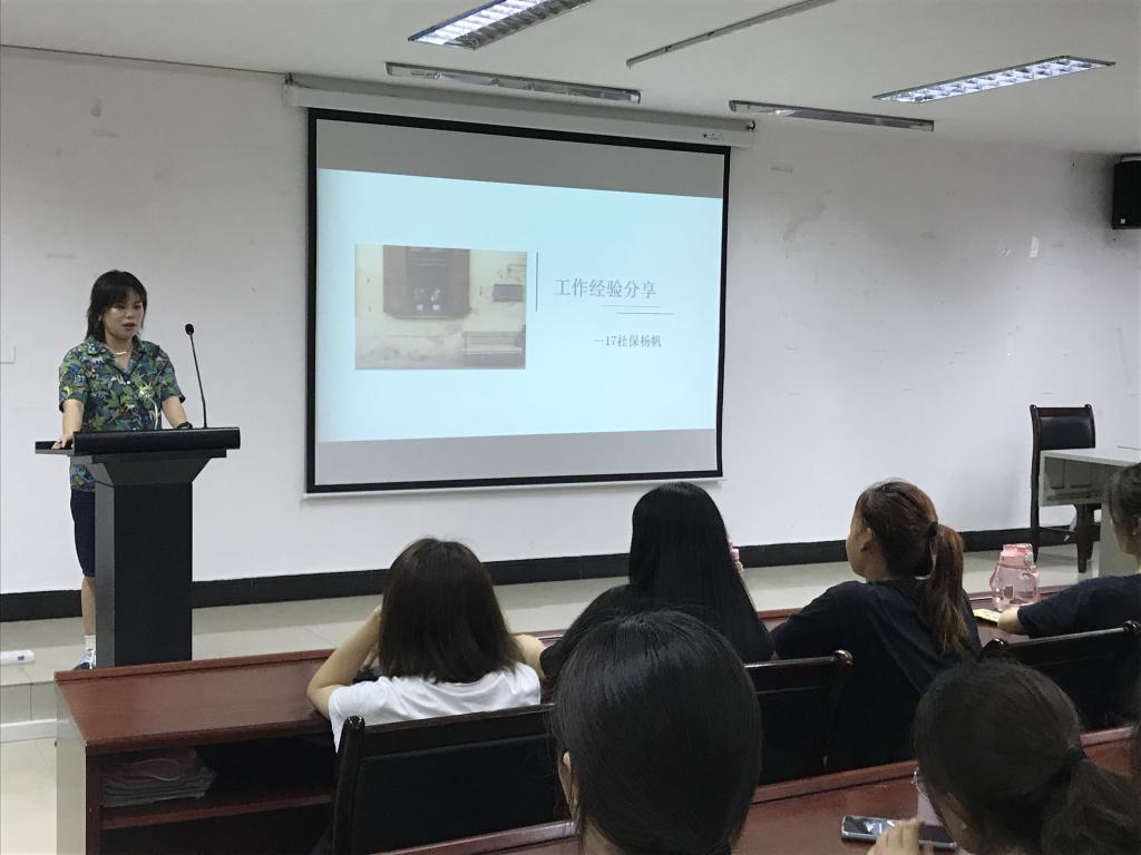 为使“保险公司经营管理”课程内容更加丰富,将书本知识同实际相联系,让学生更加了解保险公司实际工作情况,6月24日,劳动与社会保障教研室在荟文楼207教室举行2017届毕业生工作经验分享会,邀请在平安人寿实习的学生进行经验分享。活动由指导教师刘琰秋主持,教研室主任王敏、劳动与社会保障专业2018级、2019级全体同学参加了分享会。