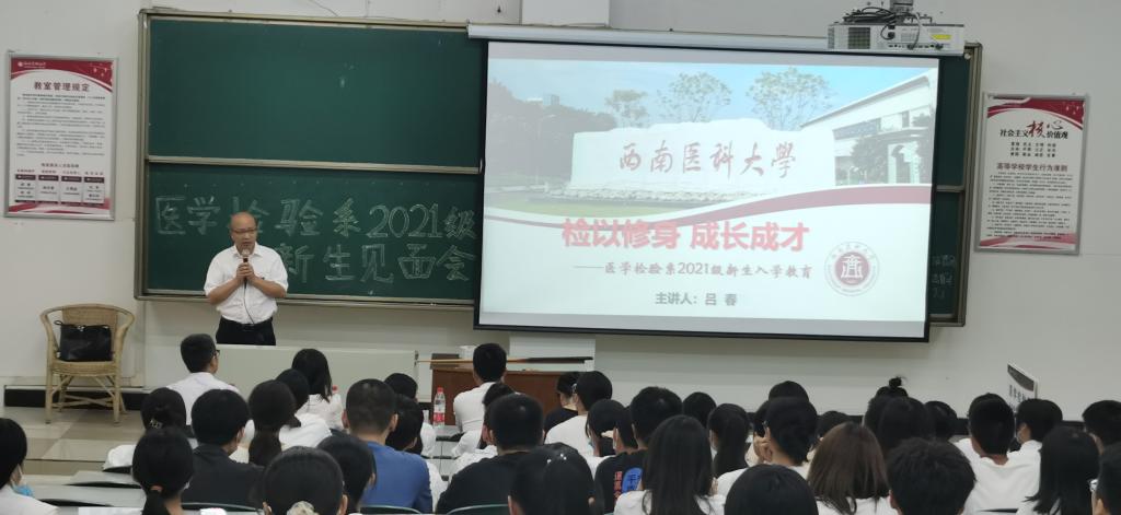 吕春对131名新同学的到来表示热烈欢迎,并以“检以修身,成长成才”为题为全体2021级新生上了“开学第一课”,介绍了学校及医学检验系基本情况,希望同学们找准定位,尽快适应大学生活;设定目标,做好大学职业规划;努力付出,收获成功的未来。最后,吕春寄语同学们要发扬西南医科大学“厚德精业,仁爱济世”的校训,树立远大理想,锤炼品德修养,练就过硬本领,努力成为“勤学善思,知行合一”的高素质人才。