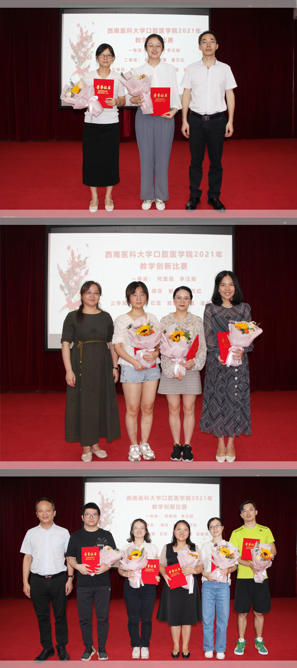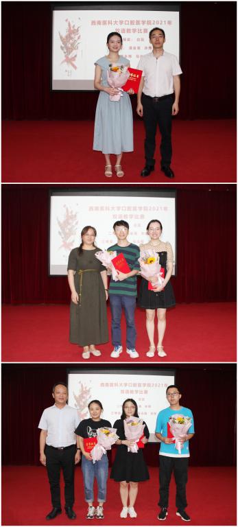 会上,医院对各类教学竞赛获奖人员进行了表彰。退休院领导杨四维为荣获2021年全国口腔院(系)青年教师授课技能展示“实力非凡教师”的张晓艳颁发证书。退休院领导肖正全为首届四川省高校教师教学创新大赛“教学学术创新奖”获得者郭玲颁发证书。退休院领导陈明模为西南医科大学首届教师教学创新大赛二等奖获得者郭玲、徐晓梅颁发证书。院领导分别为学院首届“课程思政”微课比赛获奖者、2021年教学创新比赛获奖者、2021年双语教学比赛获奖者颁发证书。
