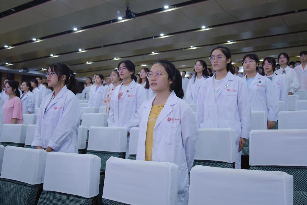 在场师生集体佩戴校徽后,全体学生在张玲萍的领誓下宣读希波克拉底誓言,宣誓之时,全场肃穆,同学们深刻感受到,医生的优秀不仅体现在能够熟练地掌握专业知识和技术上,还体现在具有较高的职业道德和职业操守上。活动结束之际杨敏再次就西南医科大学建校70周年,表达了对同学们“心中有梦,勇敢逐梦,拥抱医大”的殷切期望,指出西南医大人砥砺奋斗的精神形成了我校的红色基因,希望同学们自强不息,接下中华民族伟大复兴的接力棒。