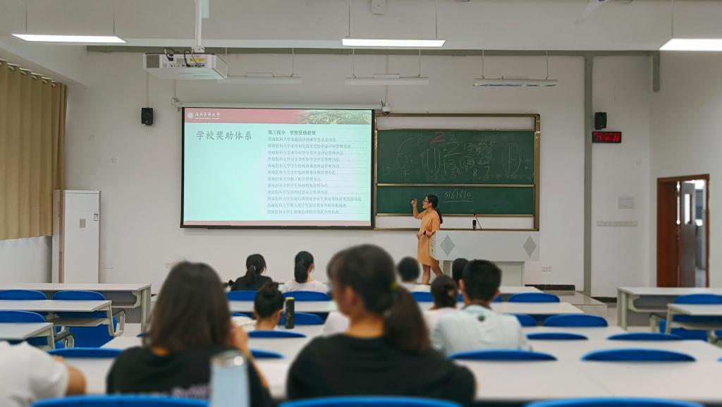 侯萍从入学前、入学时和入学后三个方面详细介绍了我校资助体系。入学前有国家助学贷款和新生入学资助项目;入学时,学校设立绿色通道,成立新生奖学金;入学后,开展家庭经济困难认定,有国家奖学金、国家励志奖学金、国家助学金、困难毕业生求职创业补贴、困难毕业生就业帮扶经费等各类资助。随后,侯萍详细介绍了2021—2022学年家庭经济困难学生认定工作,强调了本次认定工作的重要性,重点讲解了《西南医科大学家庭经济困难学生认定办法》,对认定标准、工作流程、系统申报、材料上报等多方面进行重点说明。